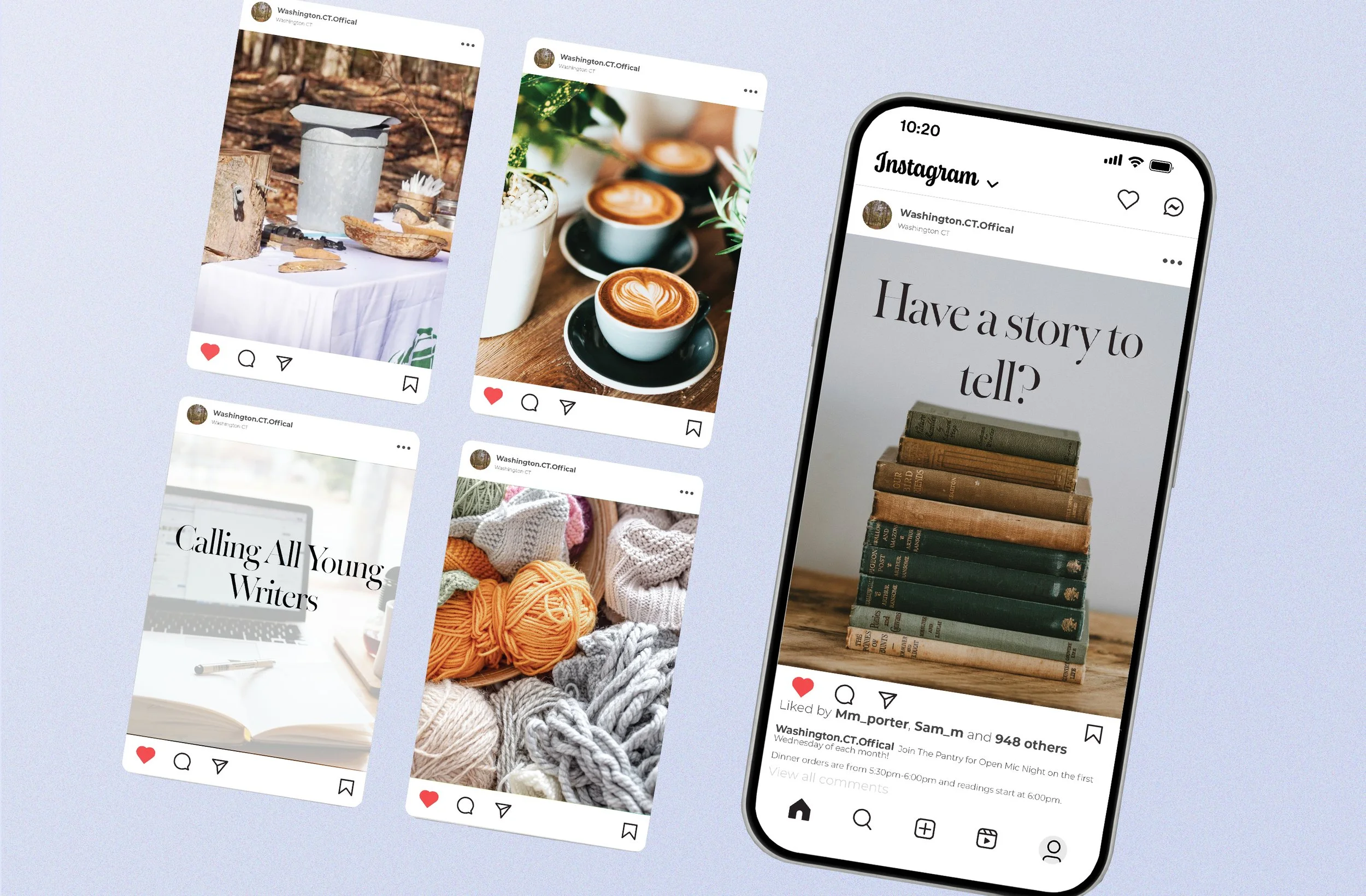 Washington, Connecticut, is a small town with big ambitions. The town needed a logo update. The problem was that there was so much in the town is was hard to narrow it down to one focal point. The church is the focal point; it is right in the center of the town. The logo is the church. For the coffee mugs, I added the logo, but then added a bunch of colors to give the brand a pop of color. Social media just need updated when it comes to posting and keeping people informed.