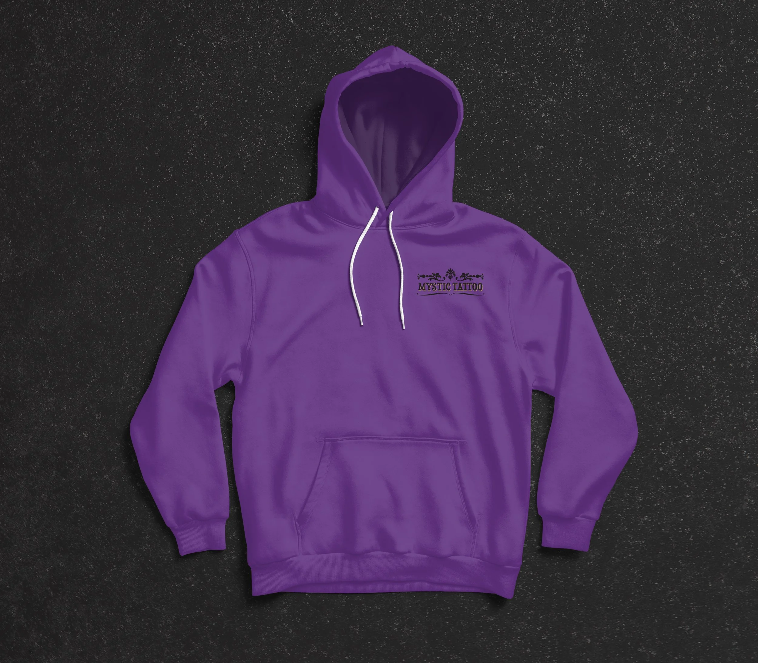 The project's name is Mystic Tattoo, a concept for a fictitious business. With the original project, there was not much in merchandising—the flyer was missing a few key elements, and the logo underwent a complete redesign. I added more options to the hoodie line. I wanted the shop to have a royal feel; all the designs feature deep, rich colors. The logo was redesigned to evoke the feel of an old speakeasy.